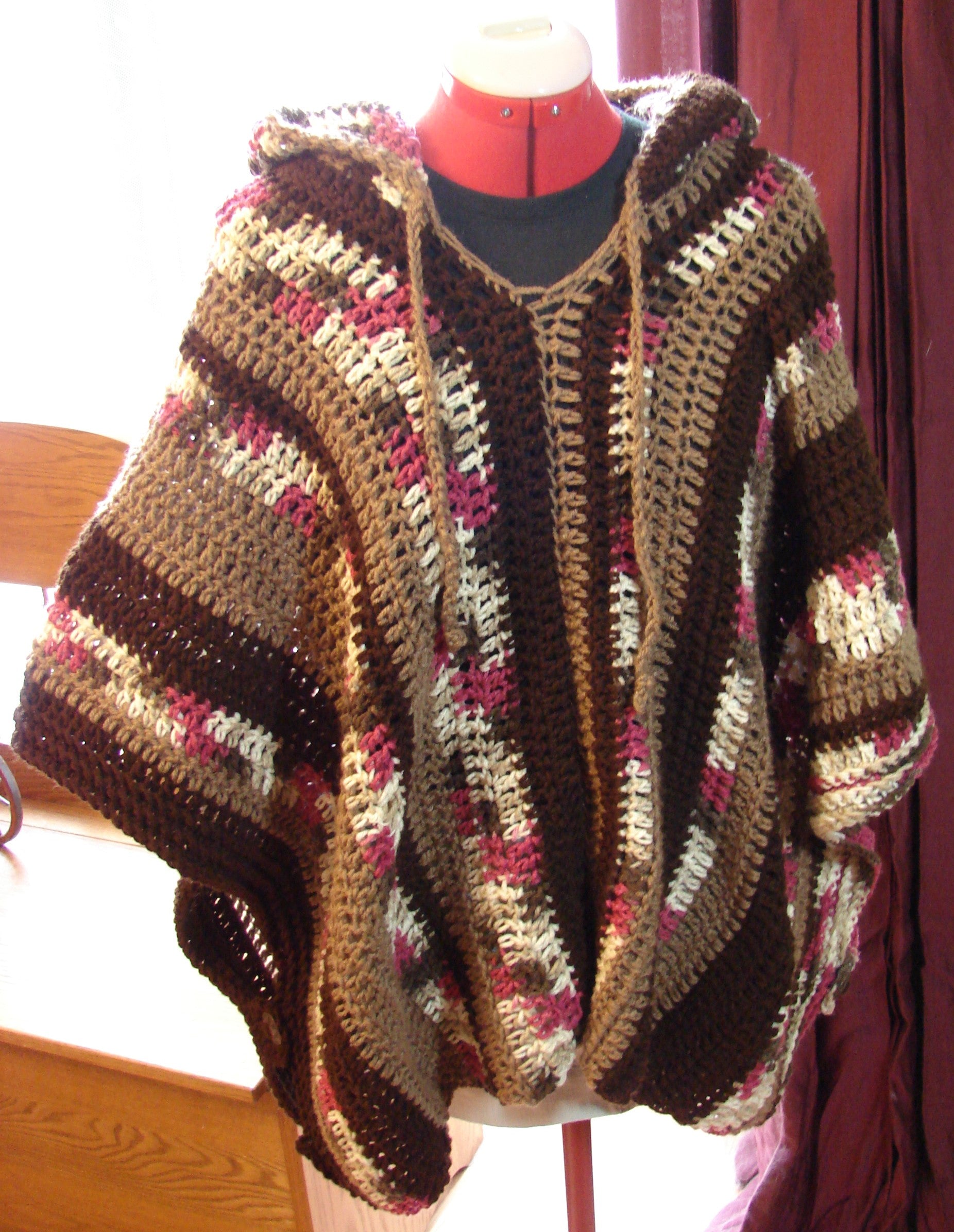 Hand Crochet Casual and Modern Hooded Adult Unisex Poncho One Size Colors of Brown and Cherry Chip