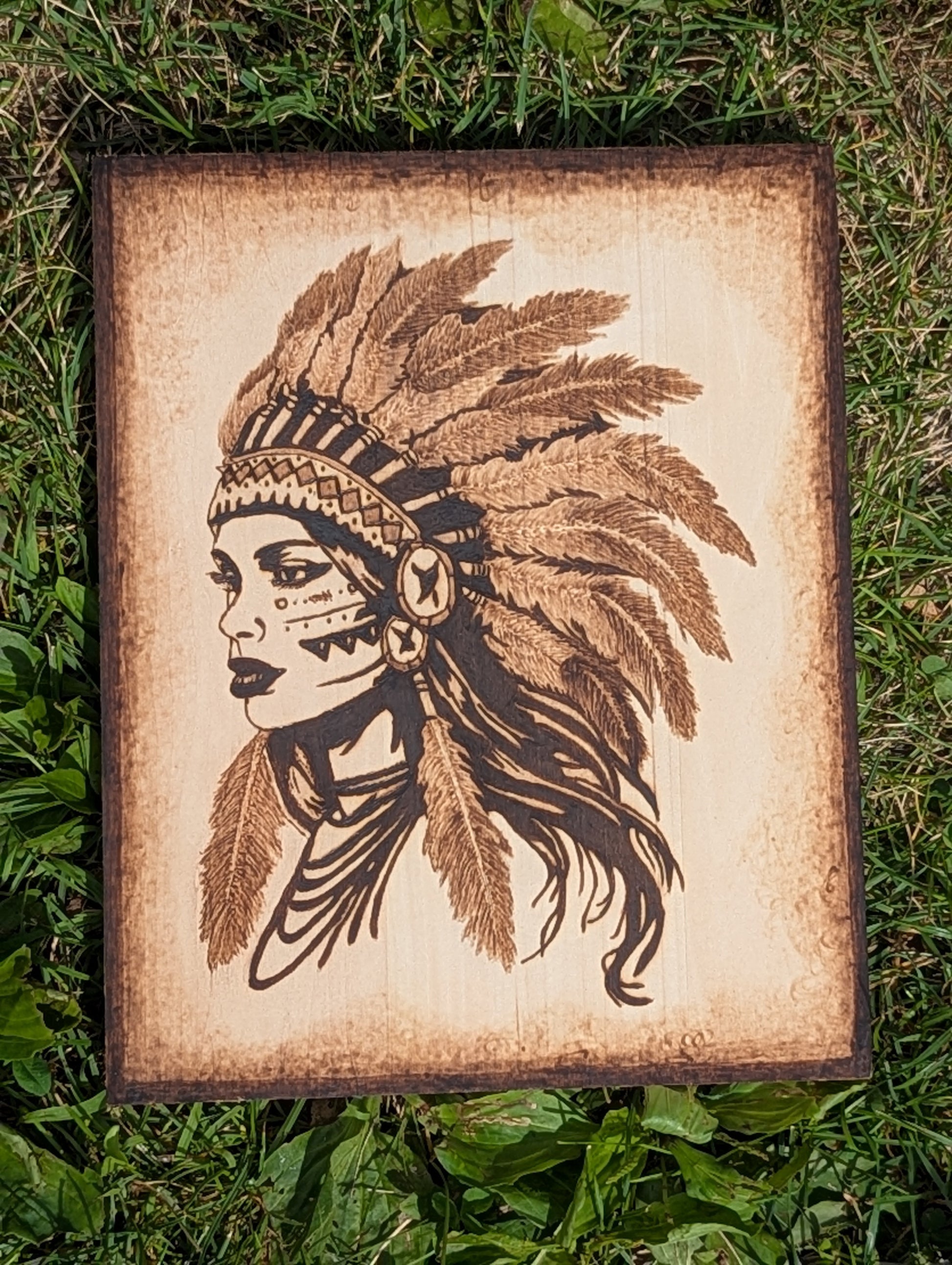 This handcrafted pyrography artwork features a Native American woman, etched with reverence and precision into natural wood. Her feathered headdress—rendered in intricate, scorched detail—cascades like a crown of tradition. Each feather tells its own story, accented with soft variations in burn depth to evoke texture and movement. The earthy sepia tones created through controlled flame give the entire piece a timeless, organic beauty. Ideal for collectors of symbolic and nature-inspired art, this piece invites reflection and connection to the ancestral spirit.